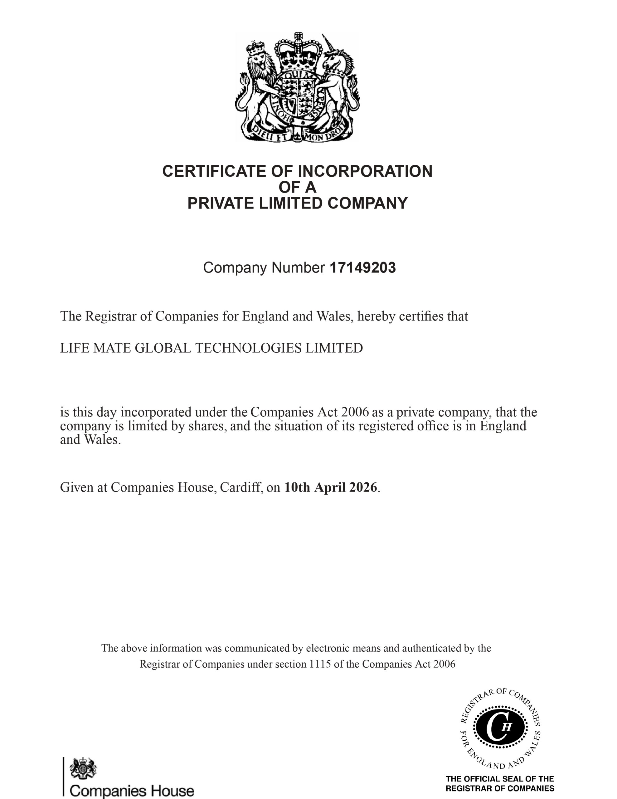 We are pleased to announce that our company is officially registered in the United Kingdom